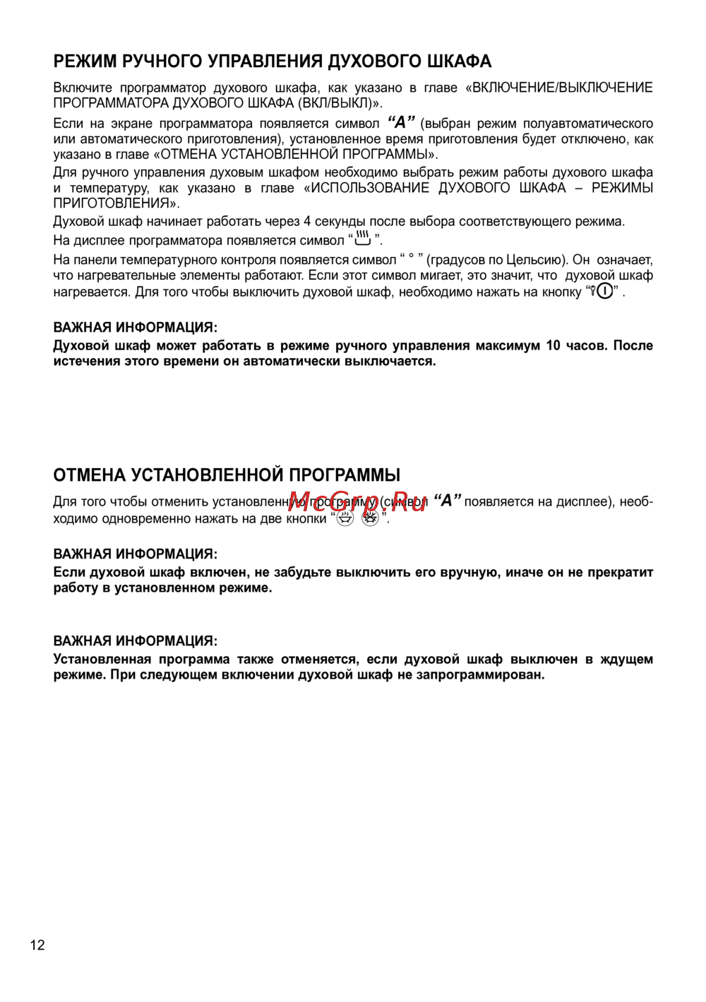 Духовой шкаф может работать в режиме ручного управления максимум 10 часов. После