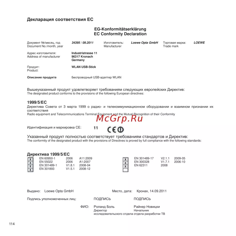 Выдано: Loewe Opta GmbH Место, дата: Кронах, 14.09.2011