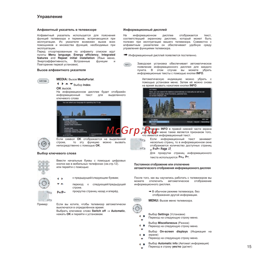 Узнайте, как использовать информационный дисплей и алфавитный указатель для управления функциями телевизора. Получите доступ к полезной информации и настройкам.