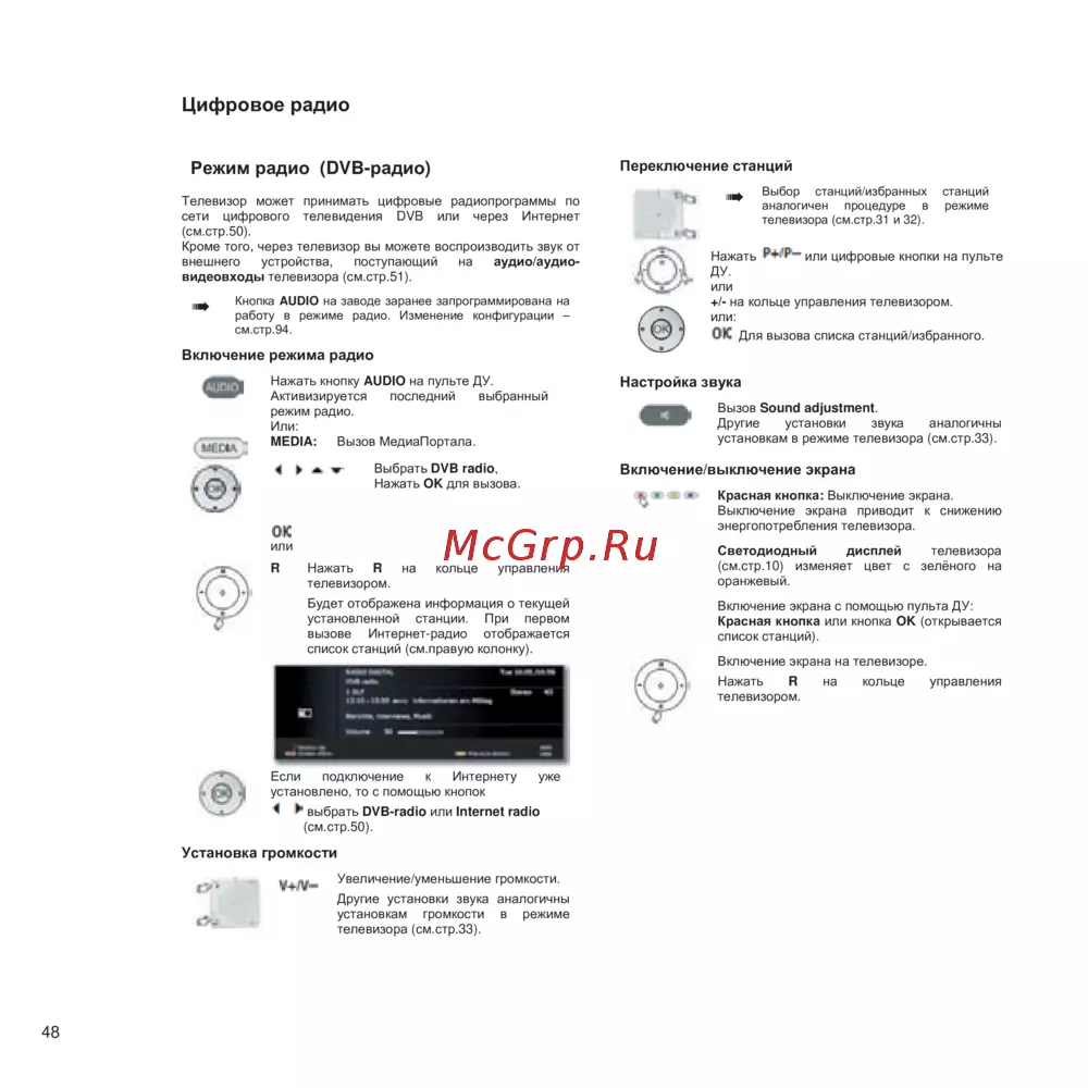 - Использование пульта ду для управления телевизором в режиме радио p.94