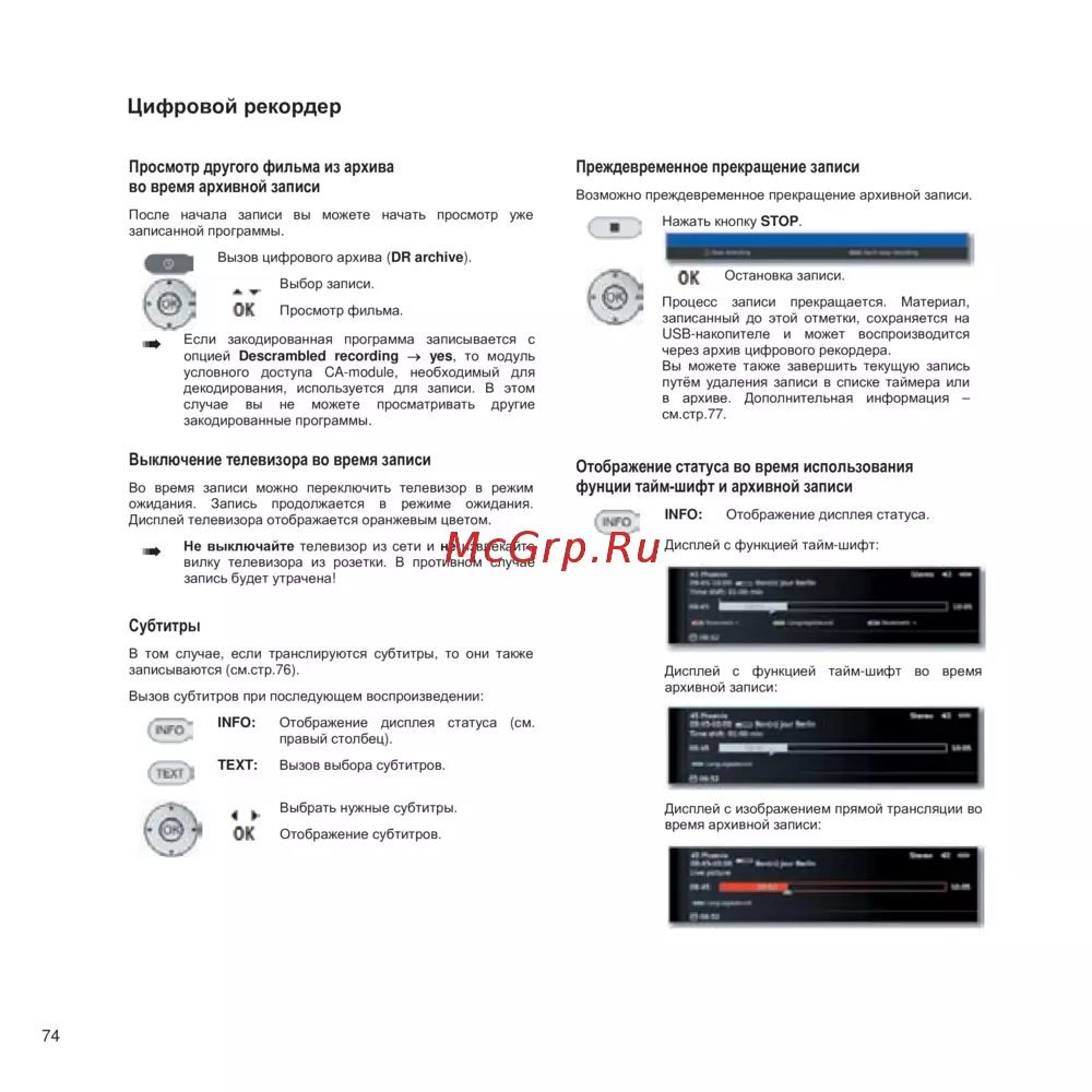 Узнайте, как управлять записями на цифровом рекордере, включая просмотр архивных программ и использование субтитров. Полезные советы по записи и остановке.