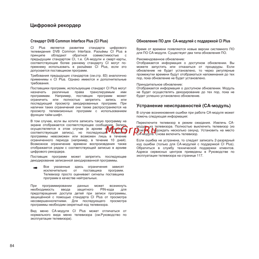 Узнайте о стандарте CI Plus для цифрового телевидения, его совместимости и ограничениях на запись программ. Получите информацию о PIN-кодах и обновлениях ПО.