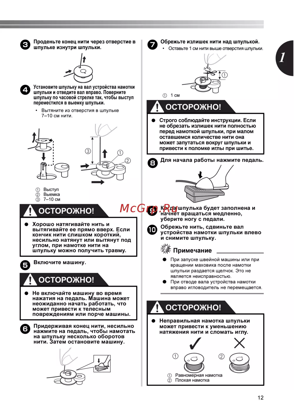 - Не включайте машину во время нажатия на педаль машина может неожиданно начать работать что может привести к телесным повреждениям или порче машины p.32