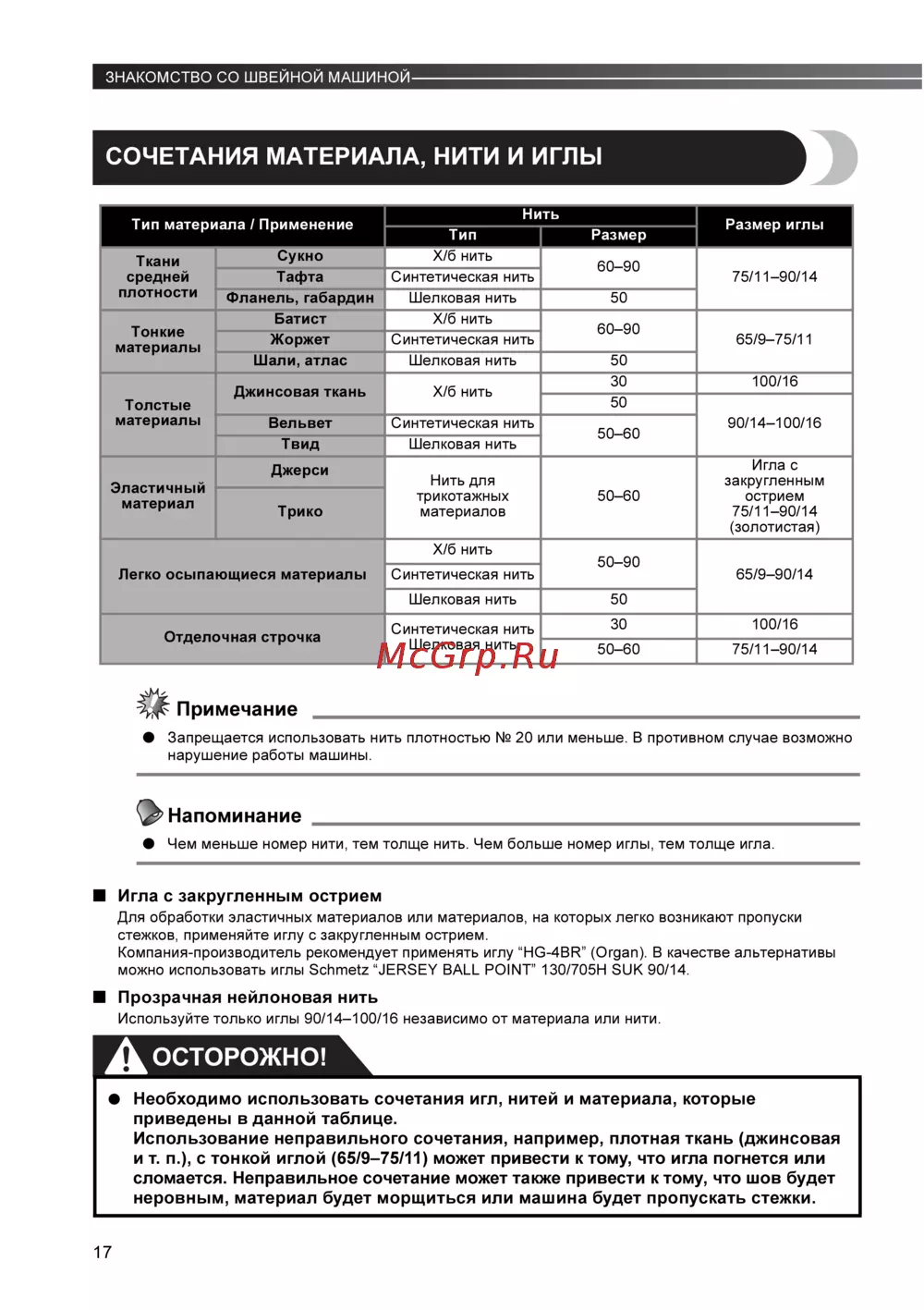 - Сочетания материала нити и игл p.39