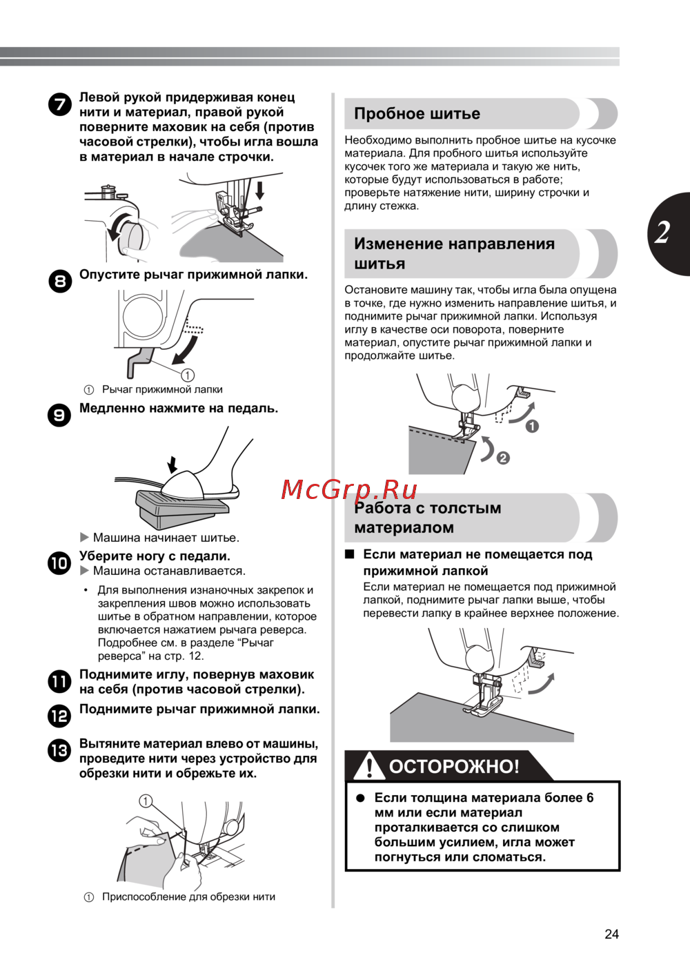 - Не включайте машину во время нажатия на педаль машина может неожиданно начать работать что может привести к телесным повреждениям или порче машины p.40