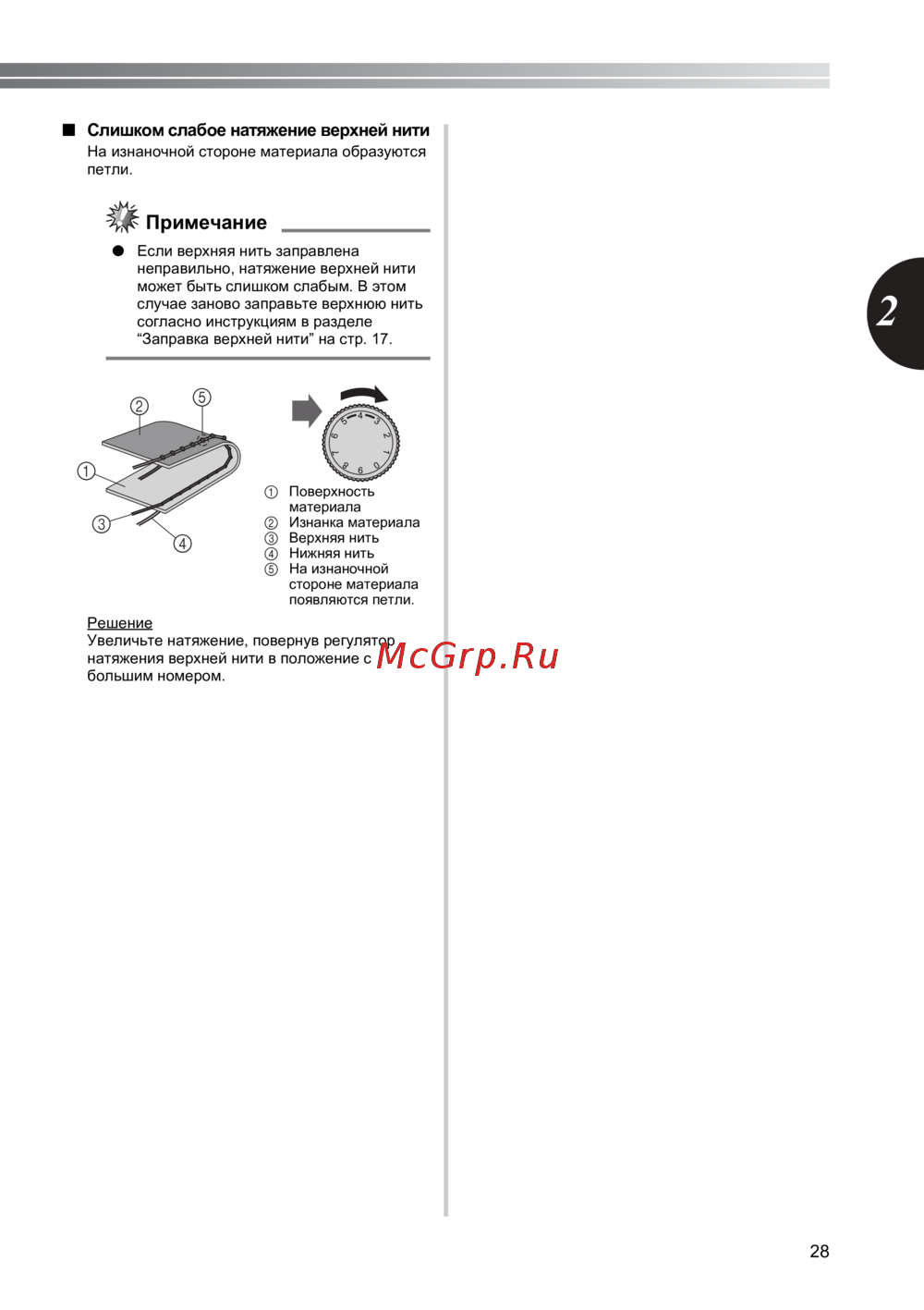 - Убедитесь что шпульный колпачок вставлен правильно так как в противном случае игла может сломаться p.42