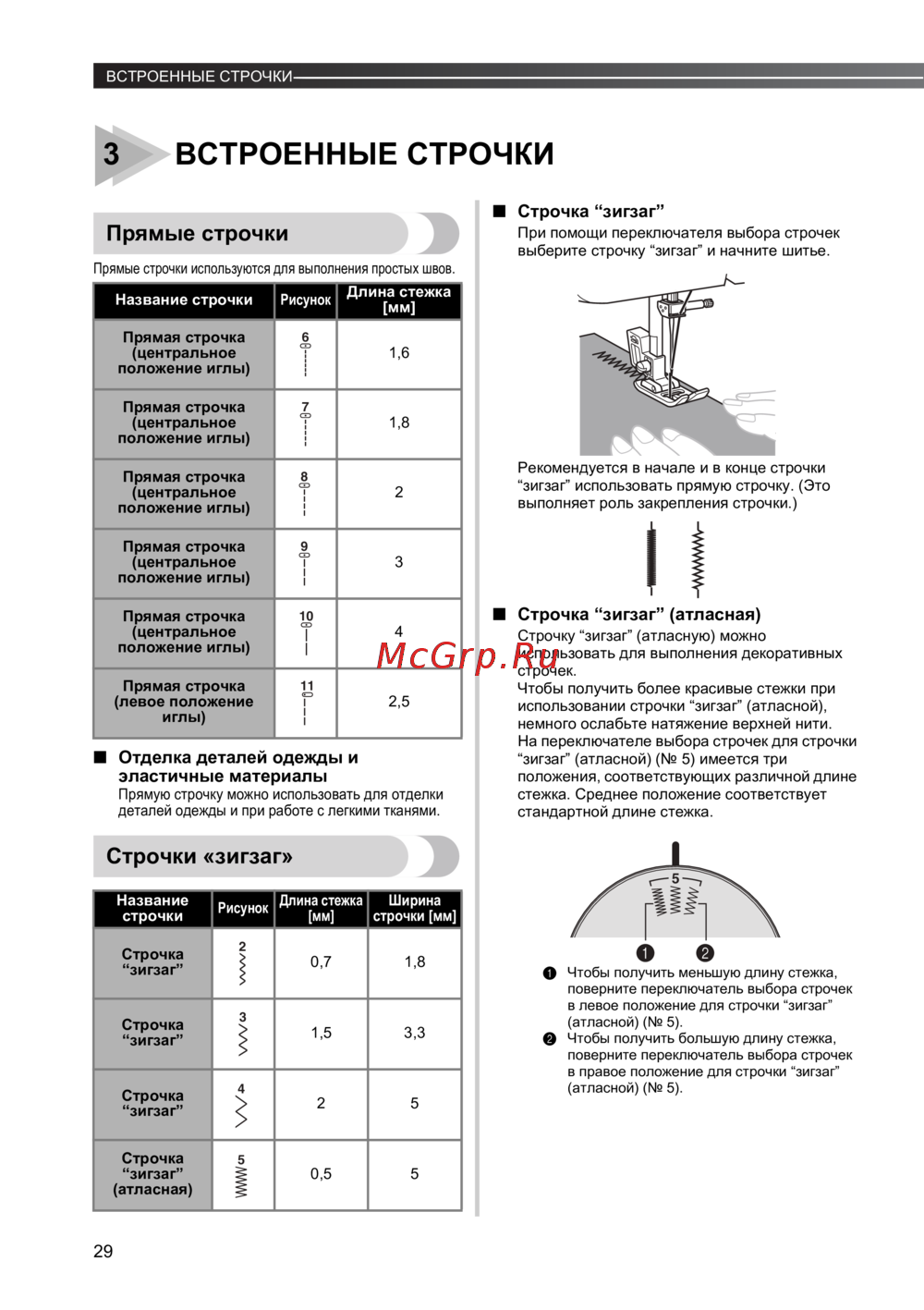 - С помощью переключателя выбора строчек зигзаг нужной ширины p.40