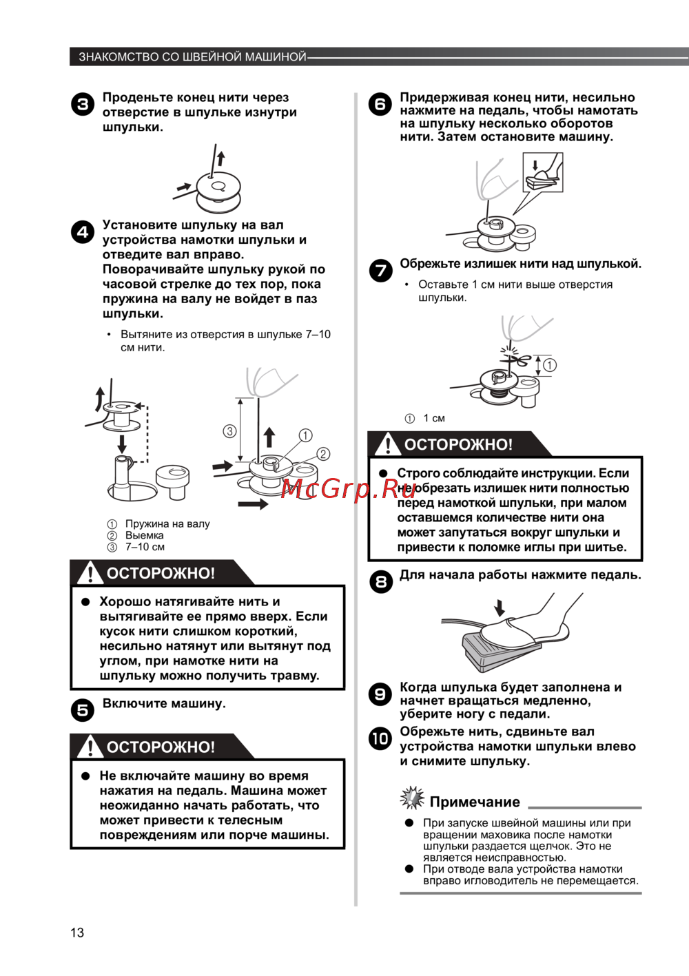 - Убедитесь что шпульный колпачок вставлен правильно так как в противном случае игла может сломаться p.42