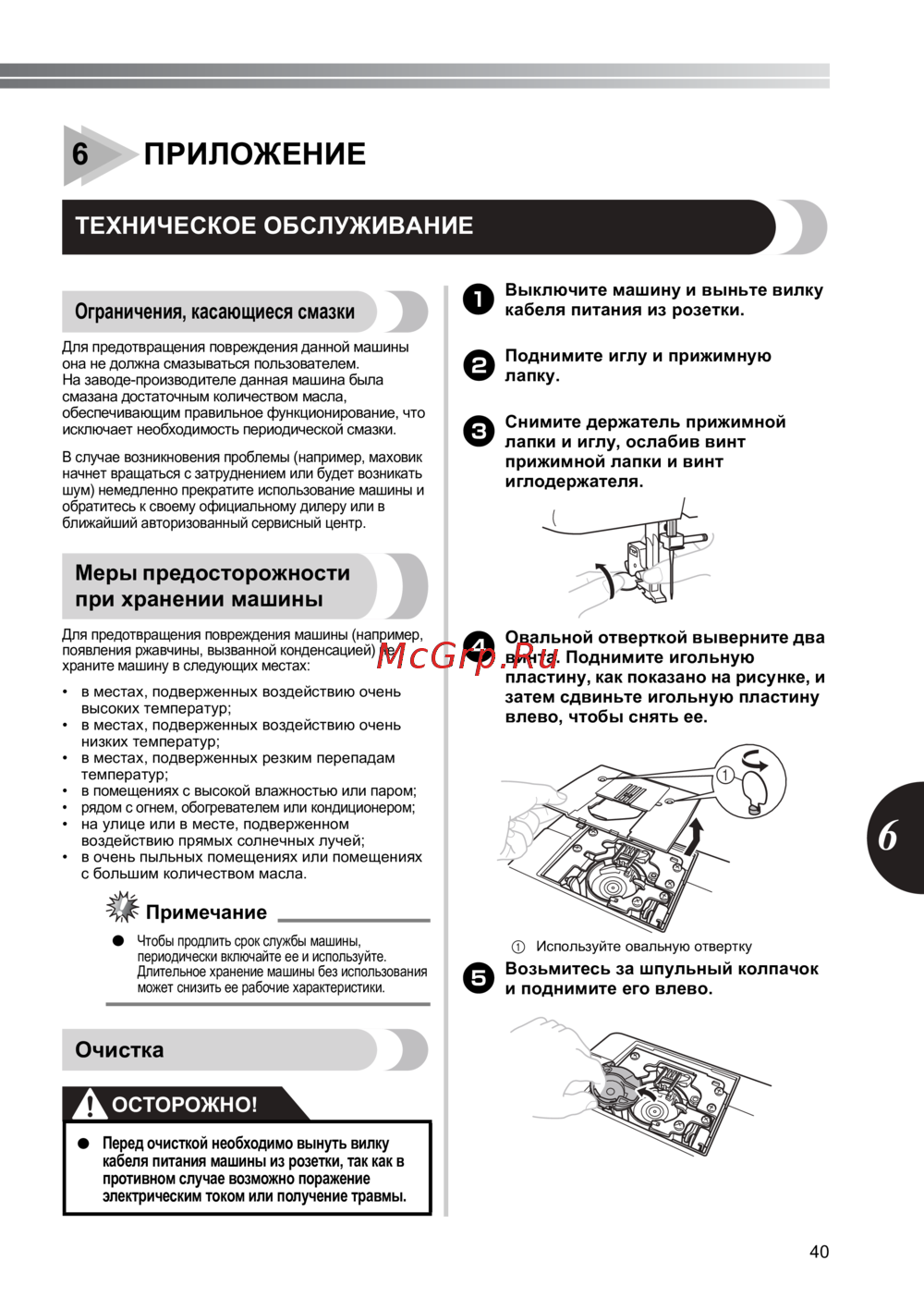 - Перед очисткой необходимо вынуть вилку кабеля питания машины из розетки так как в противном случае возможно поражение электрическим током или получение травмы p.41
