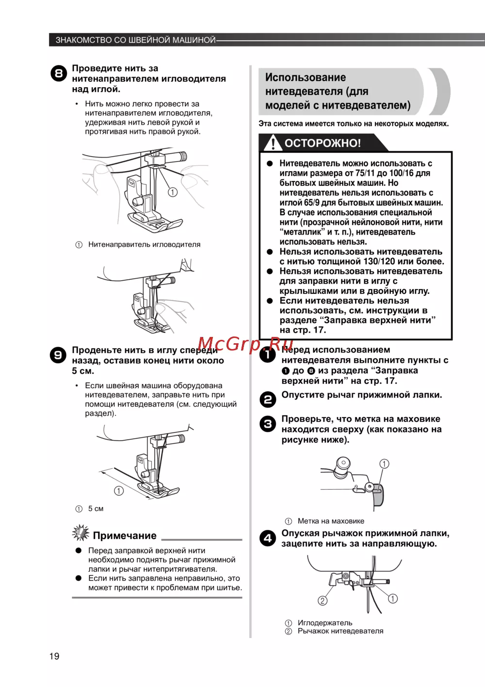 - Следите чтобы при шитье игла не ударяла по пуговице в противном случае игла может сломаться и вы можете получить травму p.38