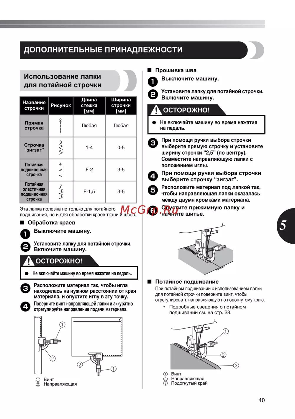 - Сначала нужно прошить переднюю закрепку опустите прижимную лапку так чтобы метки на лапке совместились с меткой на материал p.36