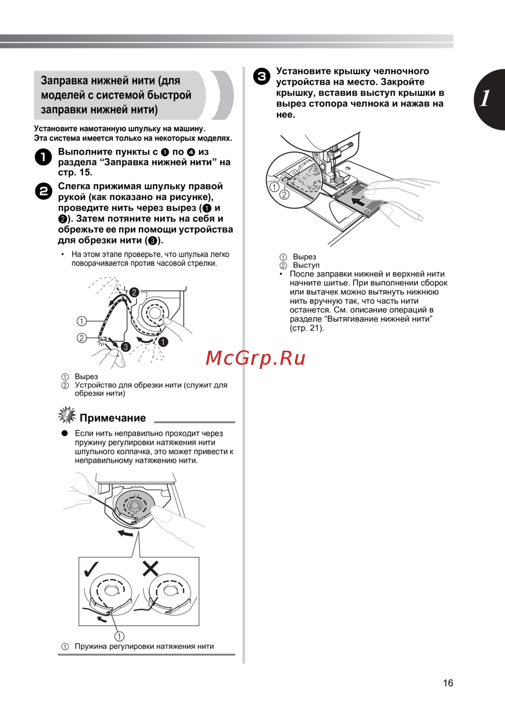 - Убедитесь что шпульный колпачок вставлен правильно так как в противном случае игла может сломаться p.42