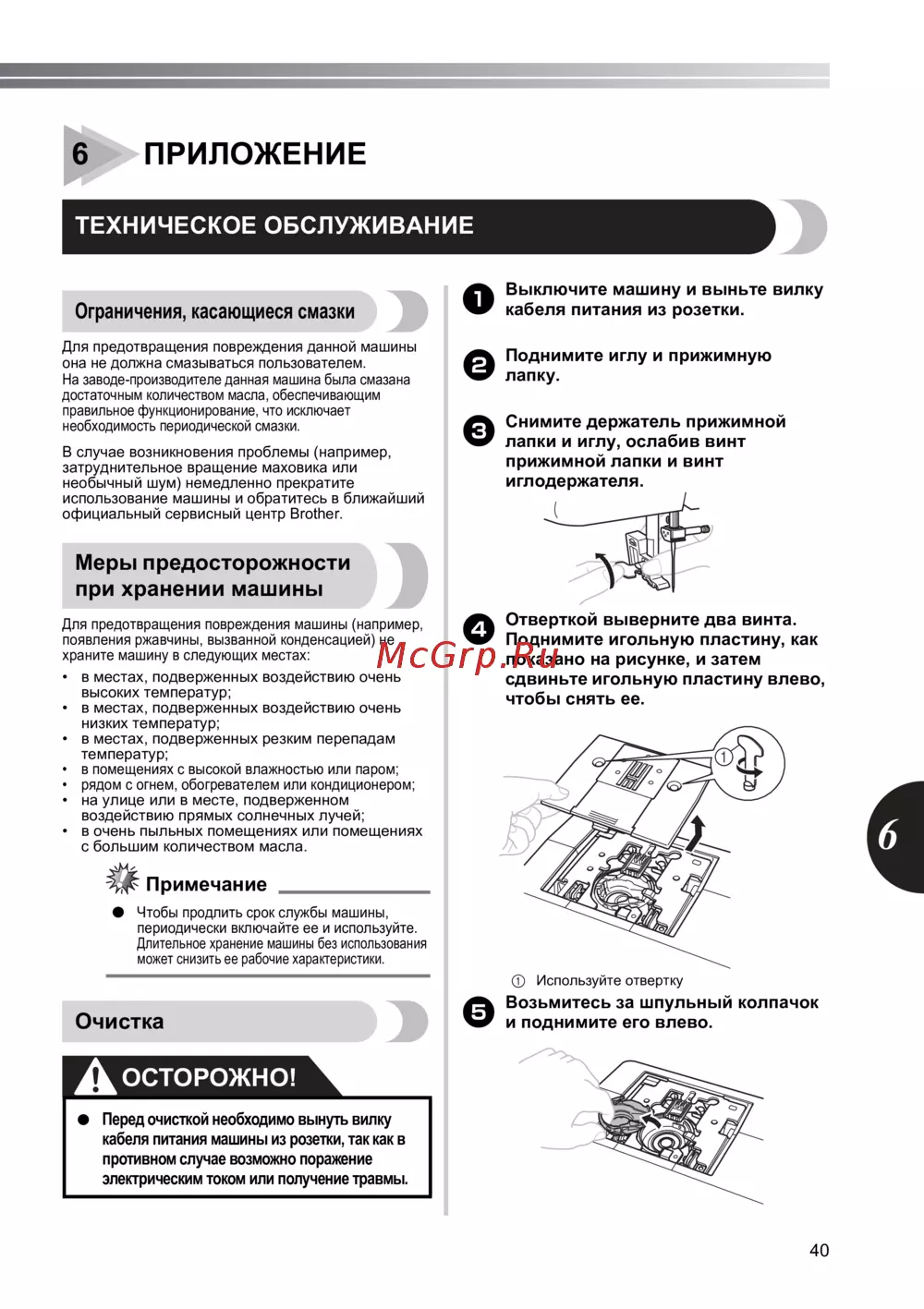 - Перед очисткой необходимо вынуть вилку кабеля питания машины из розетки так как в противном случае возможно поражение электрическим током или получение травмы p.41