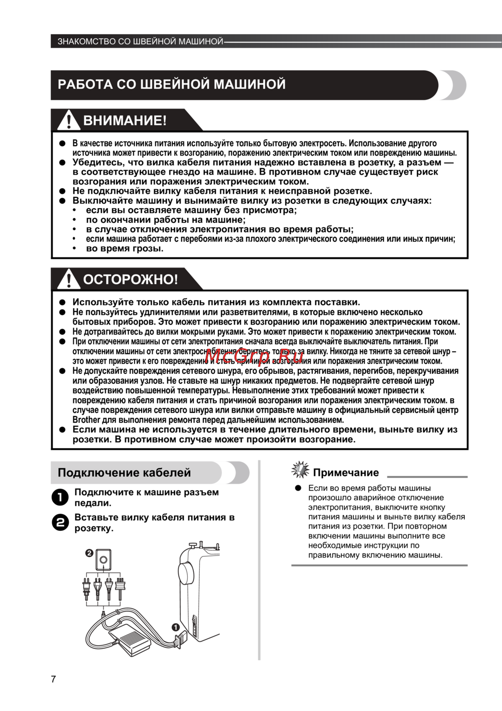 - Запрещается использовать машину если у нее поврежден кабель питания или вилка если машина плохо работает если ее уронили если она была повреждена или если на нее попала вода верните машину ближайшему официальному дилеру brother или в официальный сервисный центр для проверки ремонта и наладки ее электрической или механической части p.2