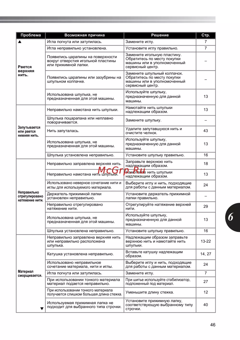 - Убедитесь что шпульный колпачок вставлен правильно так как в противном случае игла может сломаться p.45