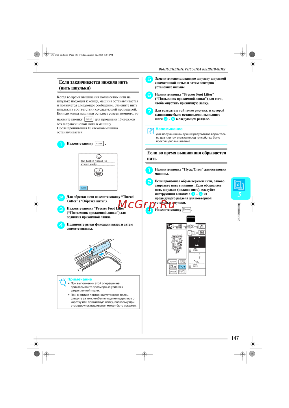 - При необходимости измените такие настройки как ширина строчки и длина стежка p.183