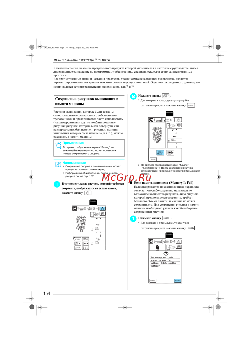 Brother Innov-is 1500 (D) [155/217] Сохранение рисунков вышивания в памяти машины