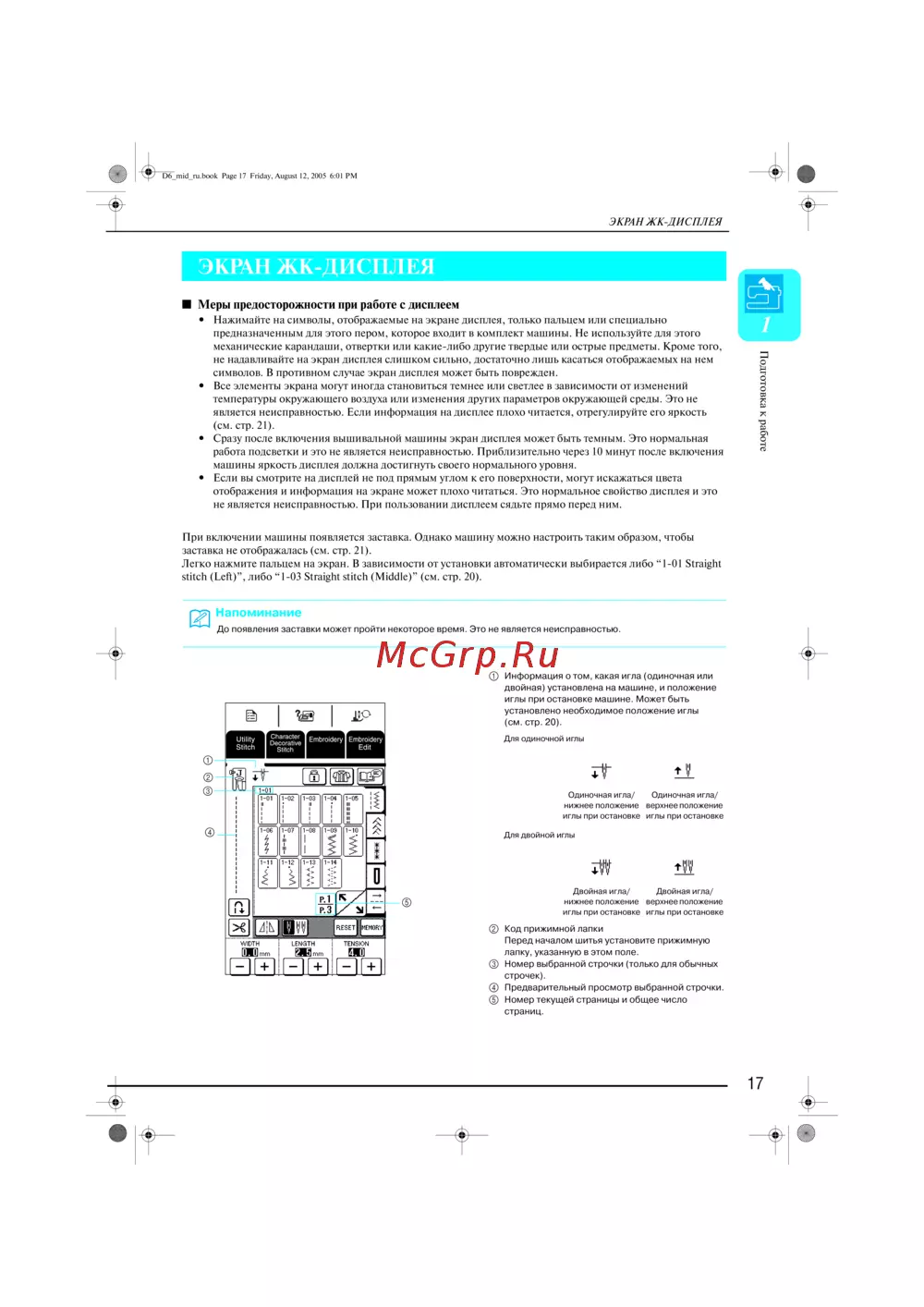• Сразу после включения вышивальной машины экран дисплея может быть темным. Это нормальная