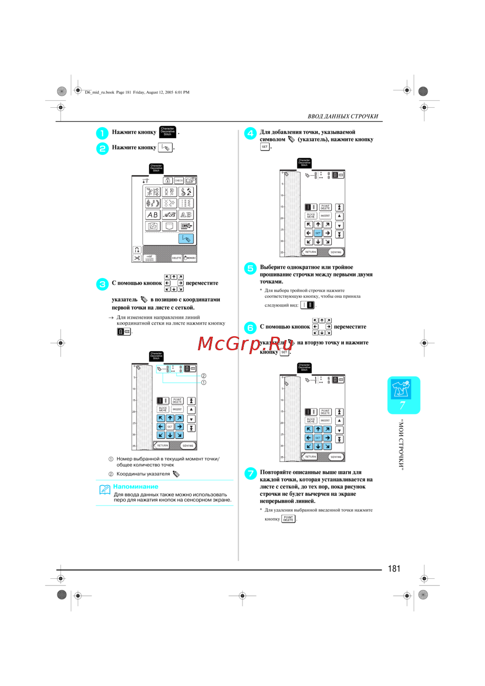 - При необходимости измените такие настройки как ширина строчки и длина стежка p.183