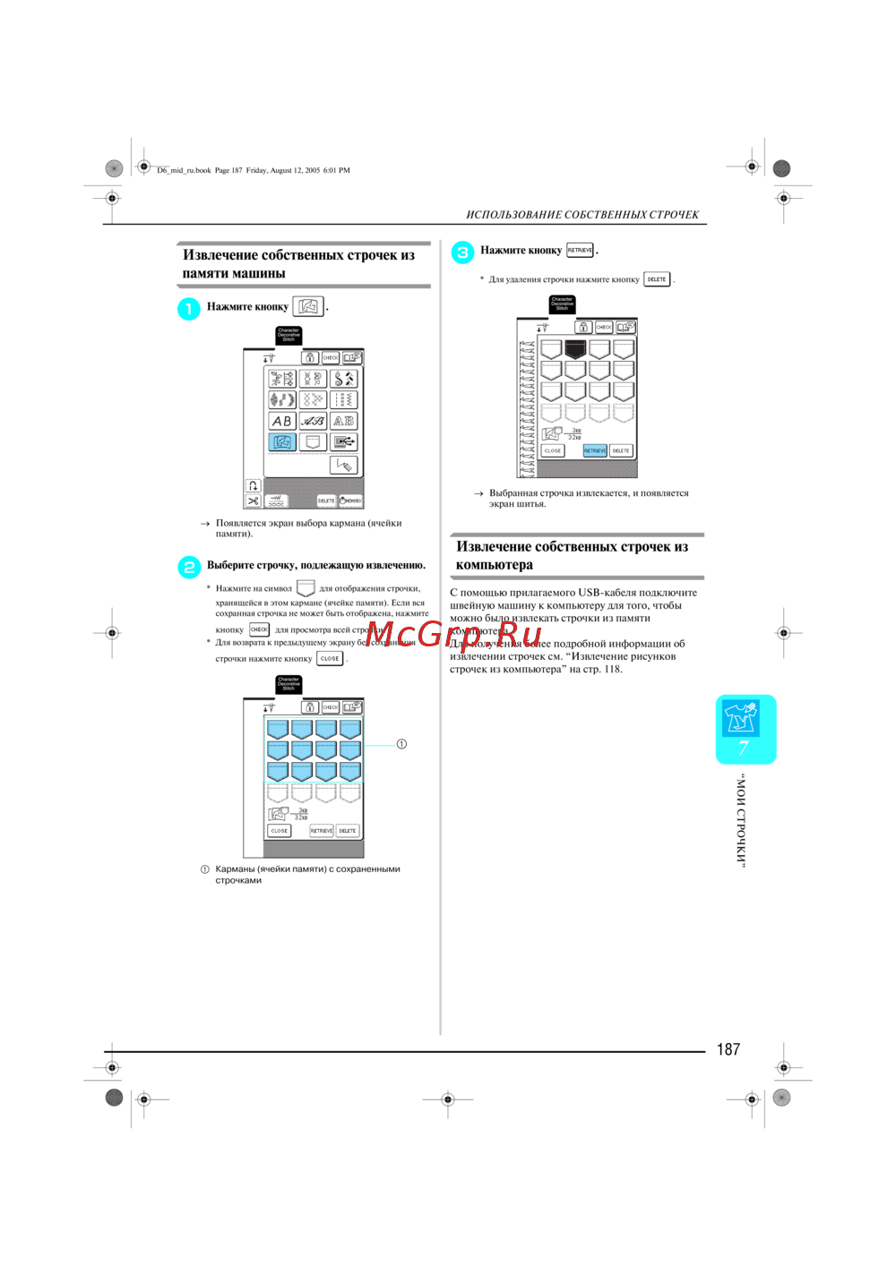 - С помощью прилагаемого usb кабеля подключите швейную машину к компьютеру для того чтобы можно было сохранять строчки в памяти компьютера для получения более подробной информации о сохранении строчек см сохранение рисунков строчек на компьютере на стр 116 p.187