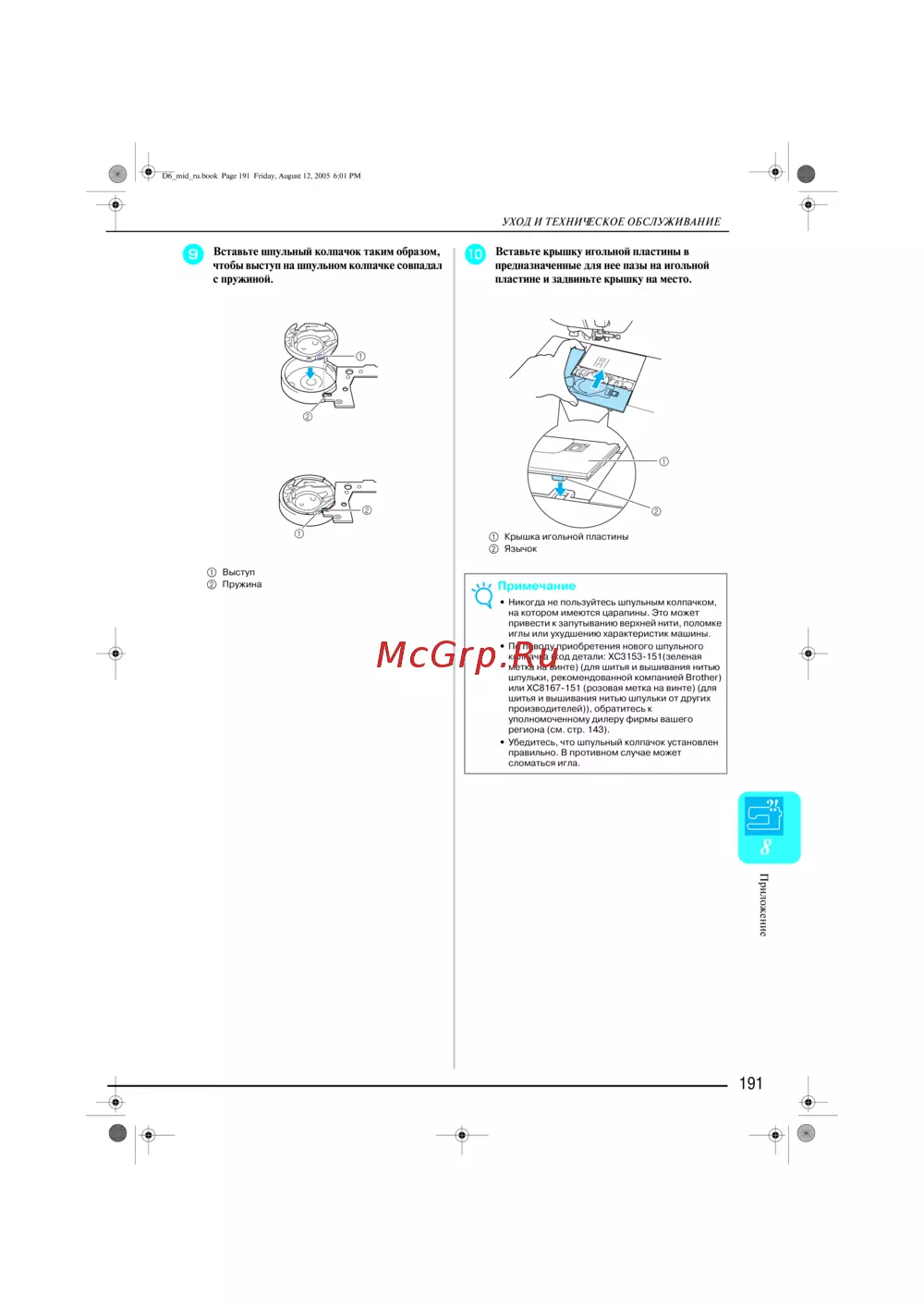 - Вставьте шпульный колпачок таким образом чтобы выступ на шпульном колпачке совпадал с пружиной p.192