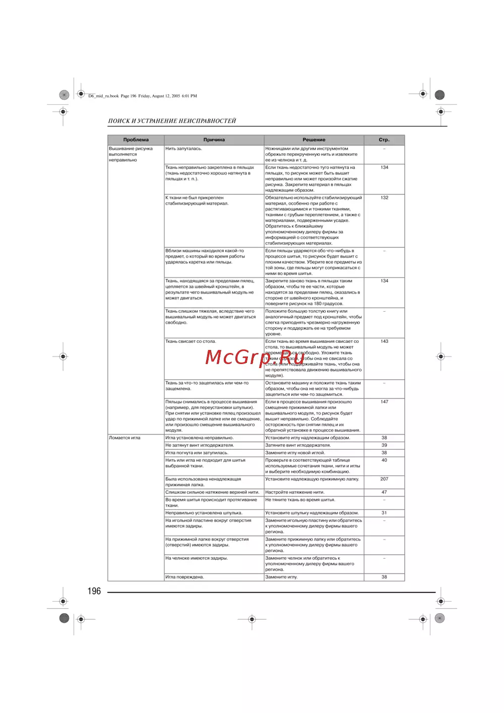 - Если со швейной машиной возникли незначительные проблемы то для их решения просмотрите приведенную ниже таблицу если предлагаемые действия по устранению неисправности не решили возникшую проблему обратитесь к уполномоченному дилеру фирмы p.195