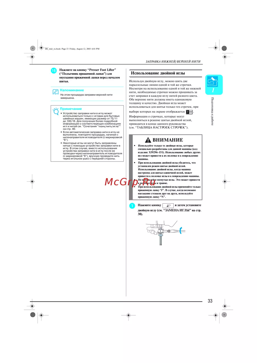 двойную иглу (см. “ЗАМЕНА ИГЛЫ” на стр.
