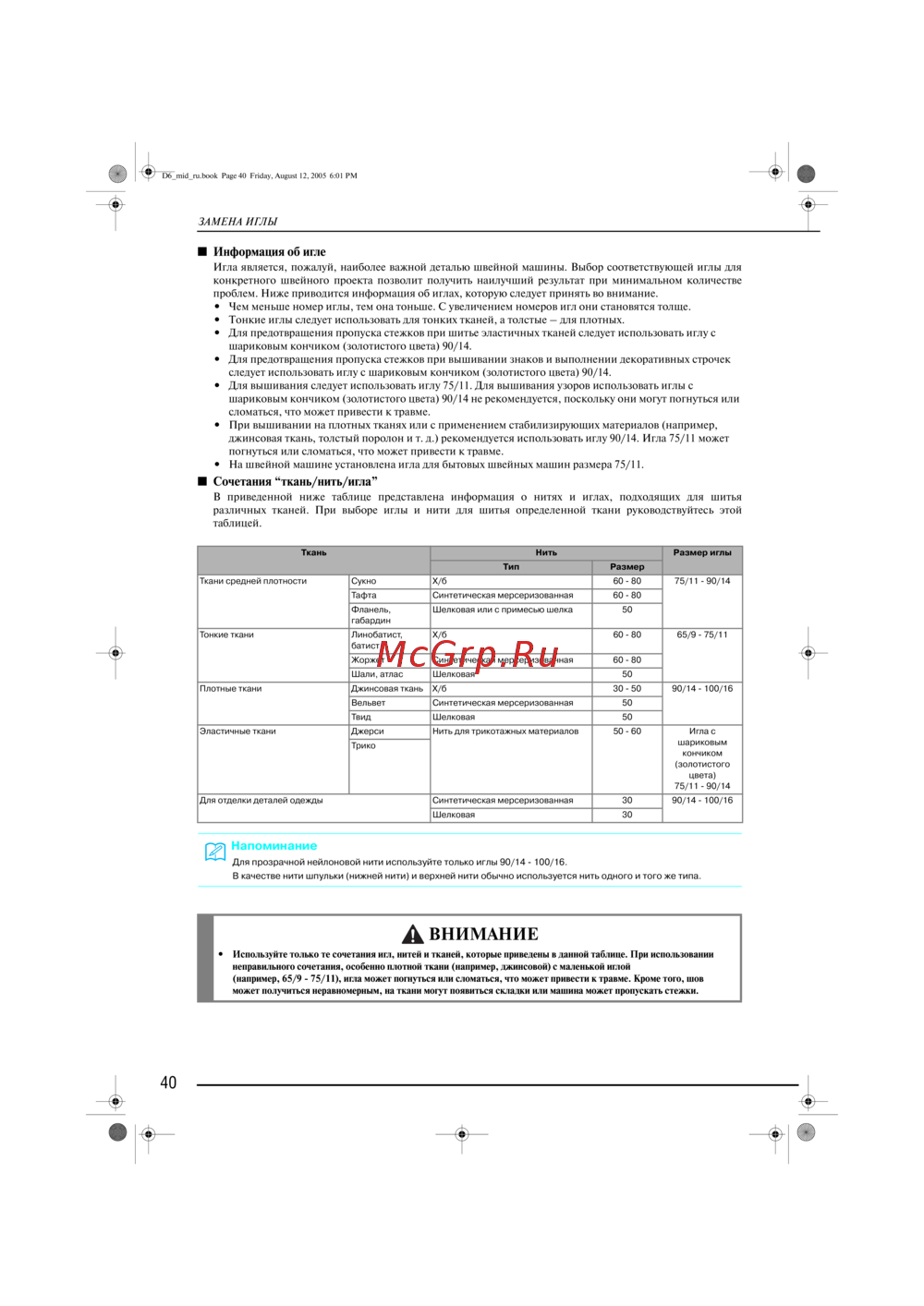 • Используйте только те сочетания игл, нитей и тканей, которые приведены в данной таблице. При использовании