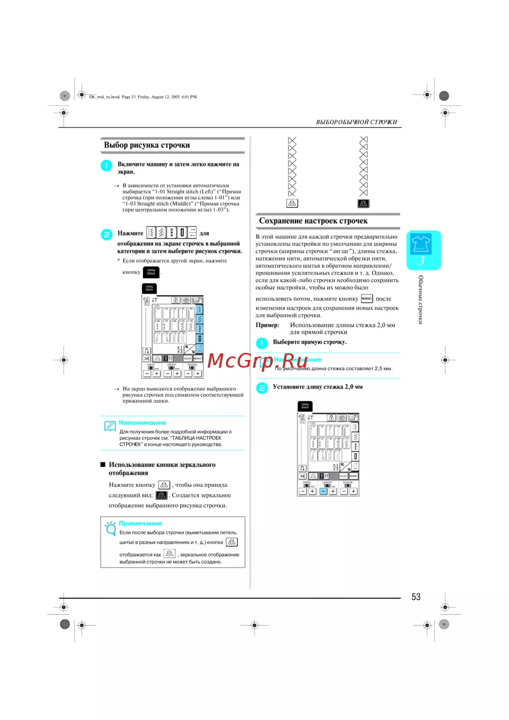 - При необходимости измените такие настройки как ширина строчки и длина стежка p.183