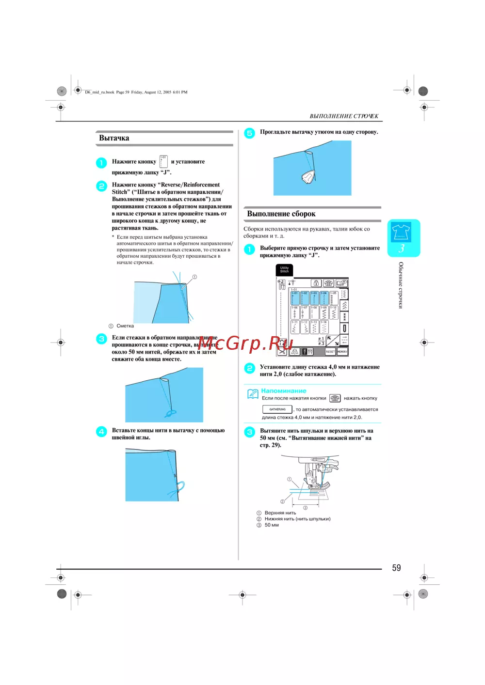 - При необходимости измените такие настройки как ширина строчки и длина стежка p.183