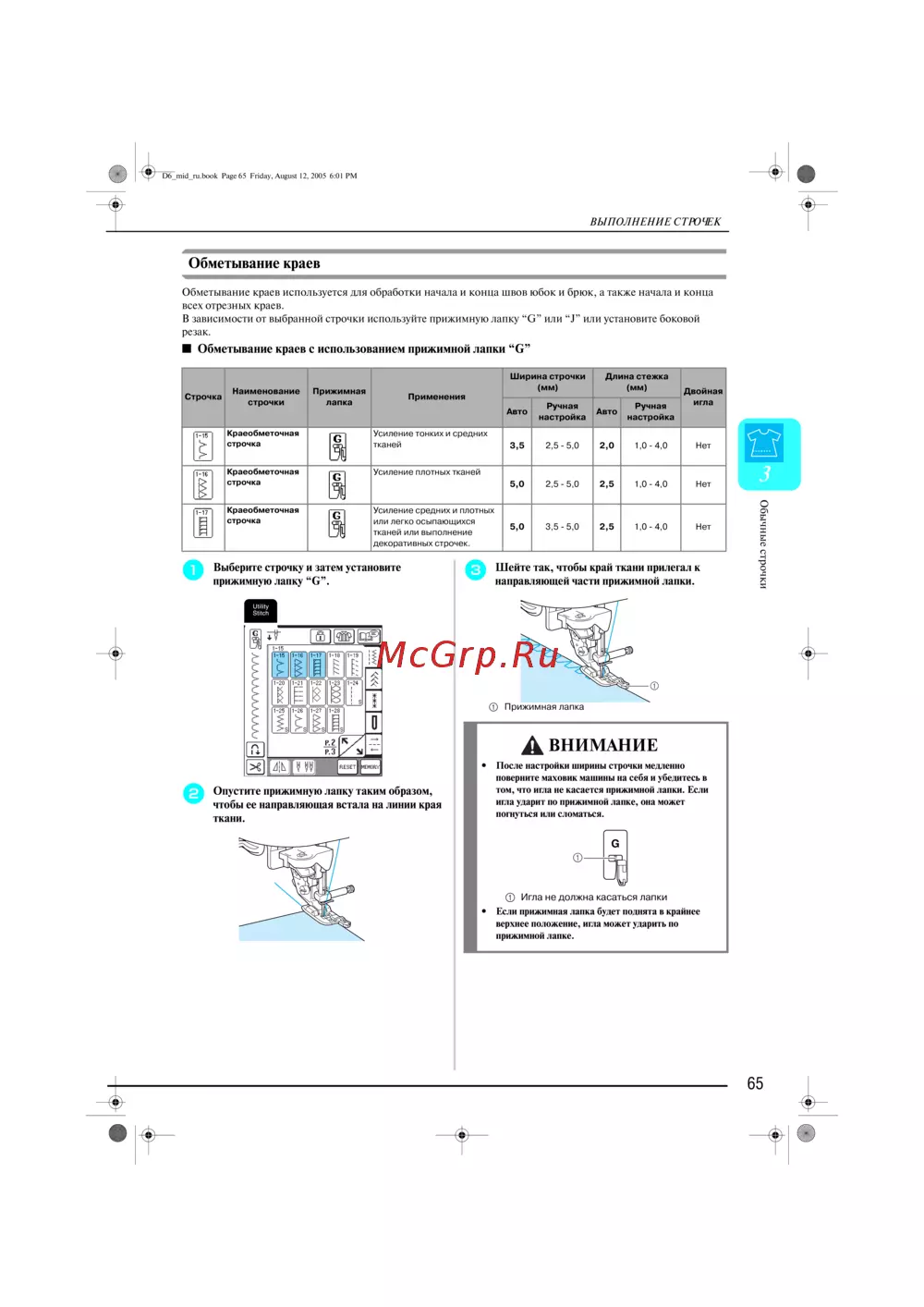 - При использовании двойной иглы см стр 33 применяйте только прижимную лапку j p.208