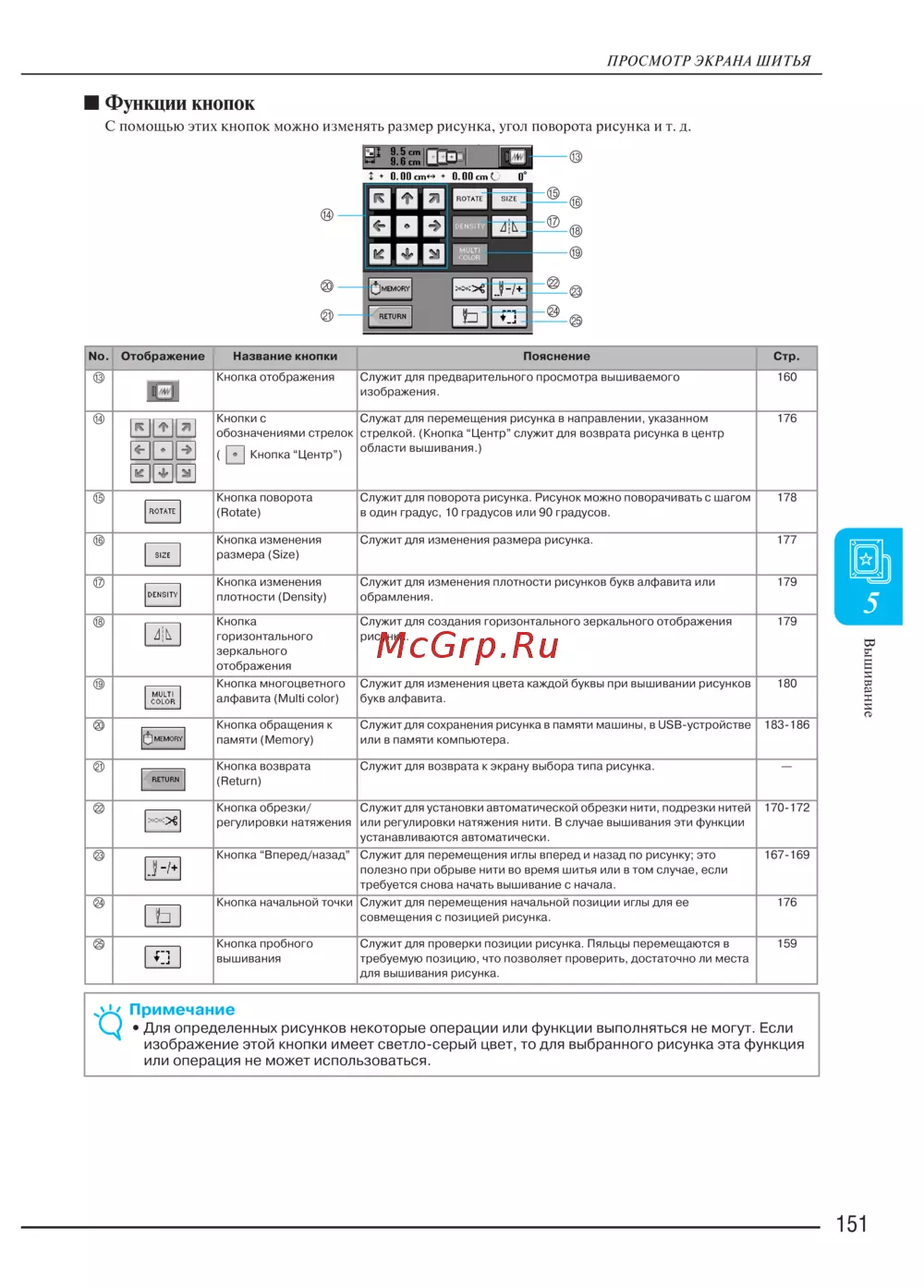 w Кнопка “Вперед/назад” Служит для перемещения иглы вперед и назад по рисунку; это