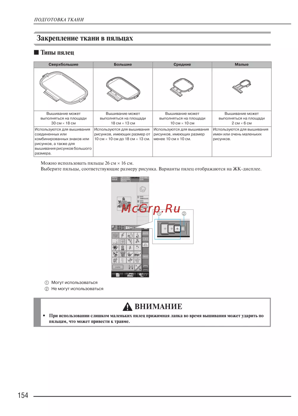 Выберите пяльцы, соответствующие размеру рисунка. Варианты пялец отображаются на ЖКJдисплее.