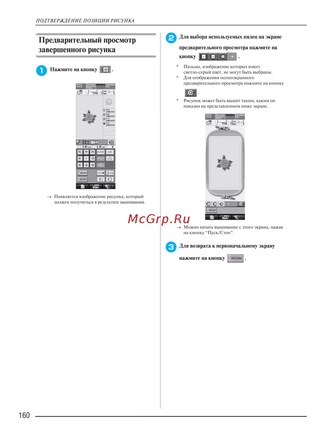 - А затем на кнопку можно во время шитья получить рекомендации по решению незначительных проблем для возврата к первоначальному экрану в любой момент нажмите на p.245