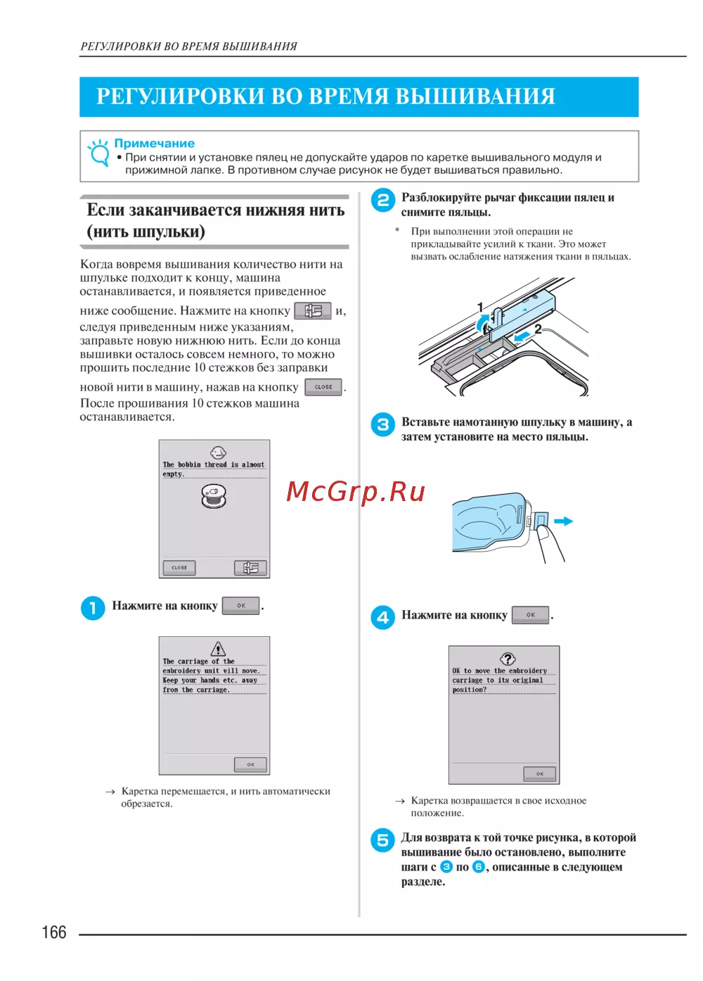 • При снятии и установке пялец не допускайте ударов по каретке вышивального модуля и
