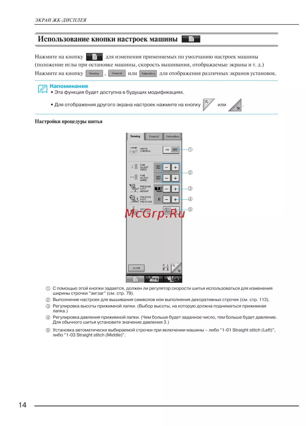 (положение иглы при остановке машины, скорость вышивания, отображаемые экраны и т. д.)