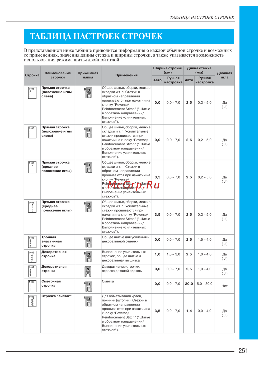 - В представленной ниже таблице приводится информация о каждой обычной строчке и возможных ее применениях значения длины стежка и ширины строчки а также указывается возможность использования режима шитья двойной иглой p.260