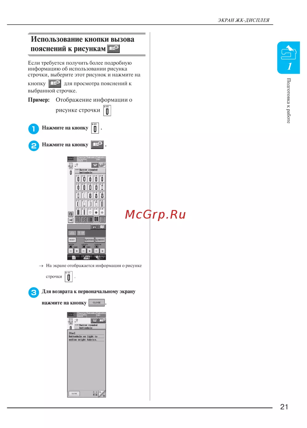 - А затем на кнопку можно во время шитья получить рекомендации по решению незначительных проблем для возврата к первоначальному экрану в любой момент нажмите на p.245