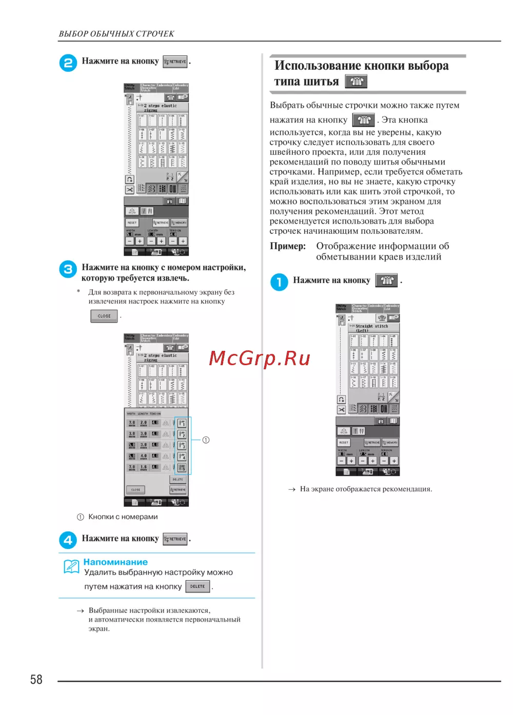 - А затем на кнопку можно во время шитья получить рекомендации по решению незначительных проблем для возврата к первоначальному экрану в любой момент нажмите на p.245
