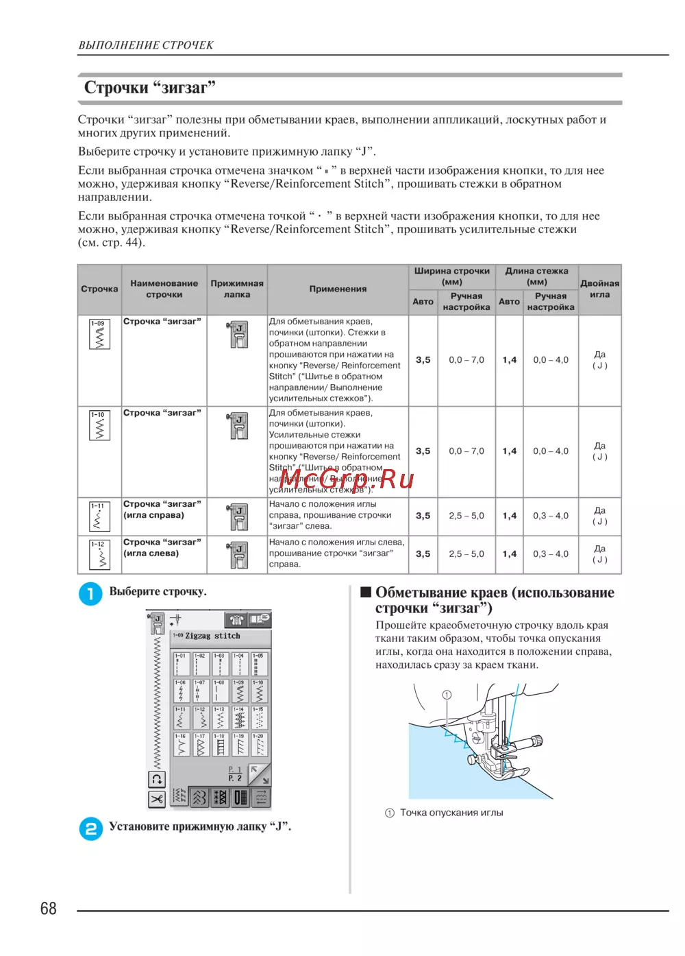 - В представленной ниже таблице приводится информация о каждой обычной строчке и возможных ее применениях значения длины стежка и ширины строчки а также указывается возможность использования режима шитья двойной иглой p.260