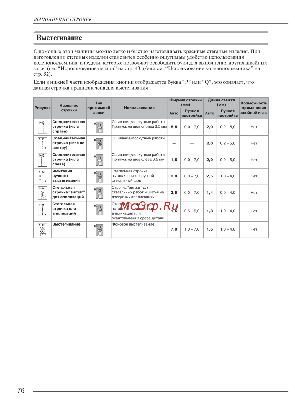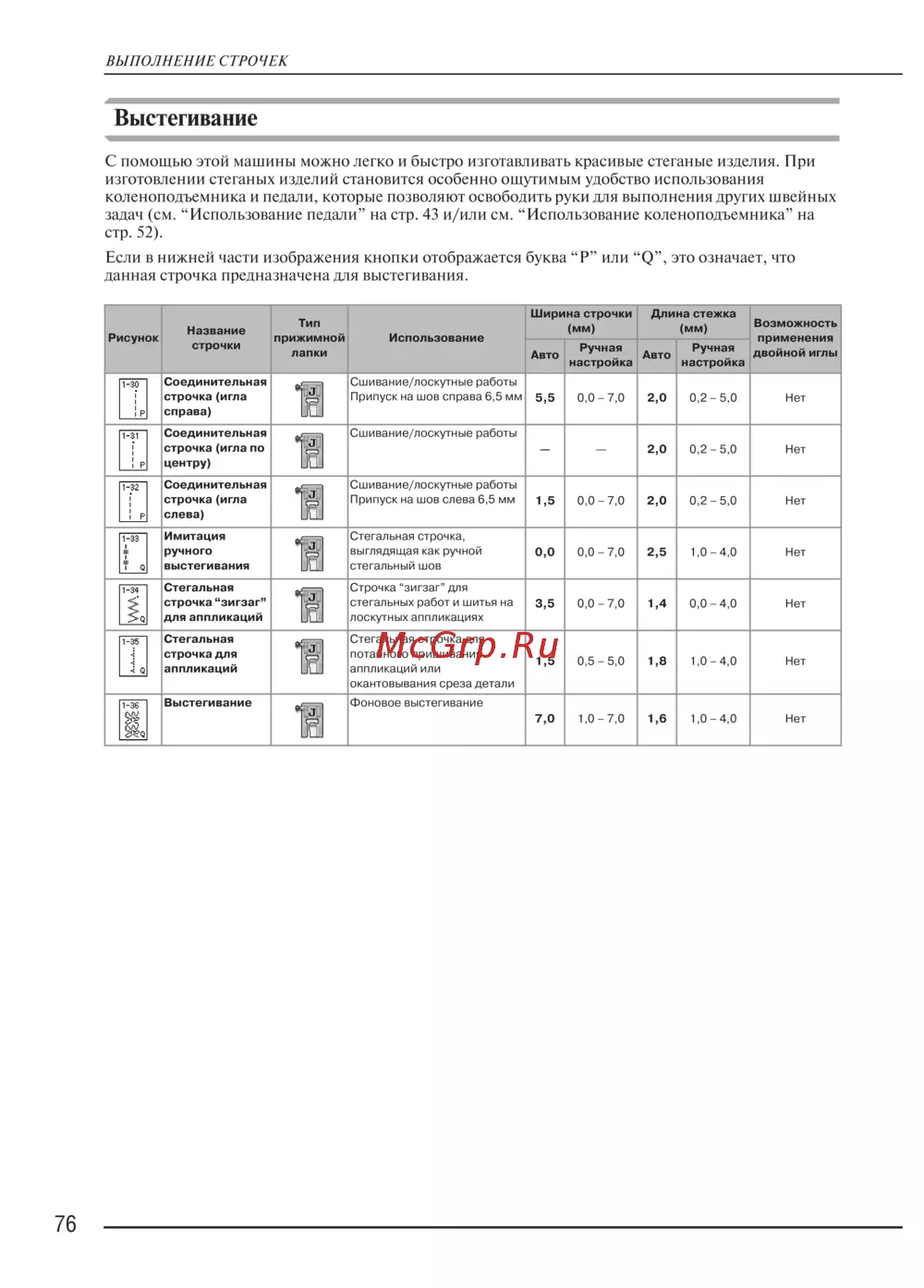 - В представленной ниже таблице приводится информация о каждой обычной строчке и возможных ее применениях значения длины стежка и ширины строчки а также указывается возможность использования режима шитья двойной иглой p.260