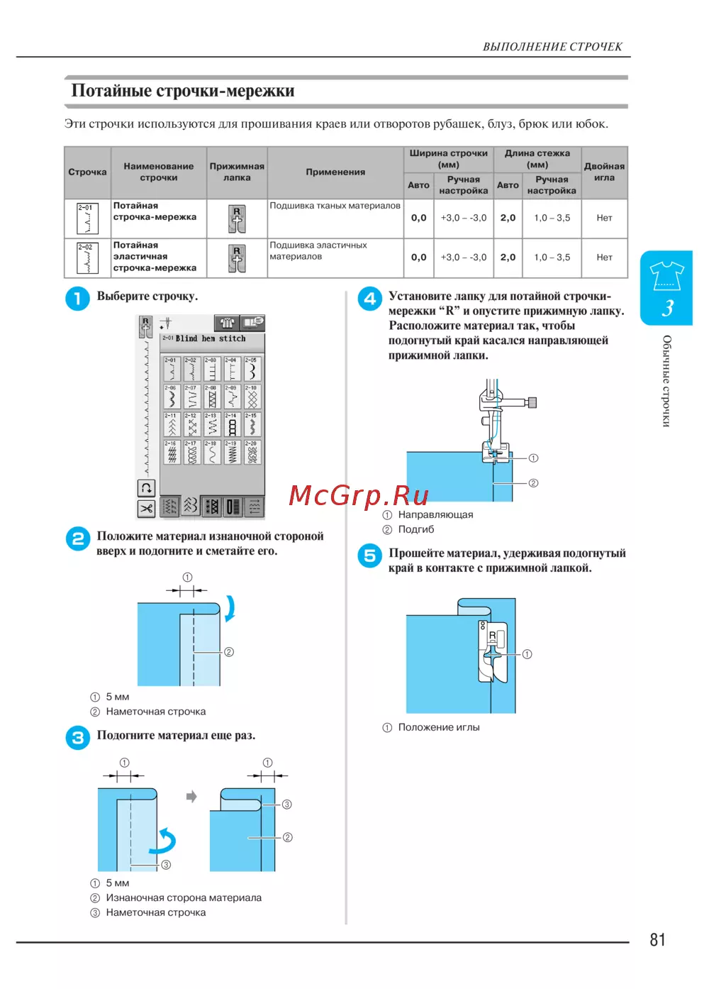 - В представленной ниже таблице приводится информация о каждой обычной строчке и возможных ее применениях значения длины стежка и ширины строчки а также указывается возможность использования режима шитья двойной иглой p.260