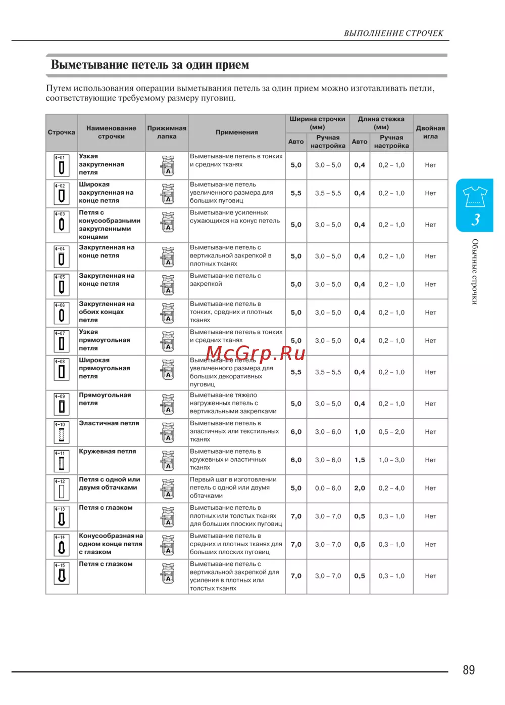 - В представленной ниже таблице приводится информация о каждой обычной строчке и возможных ее применениях значения длины стежка и ширины строчки а также указывается возможность использования режима шитья двойной иглой p.260