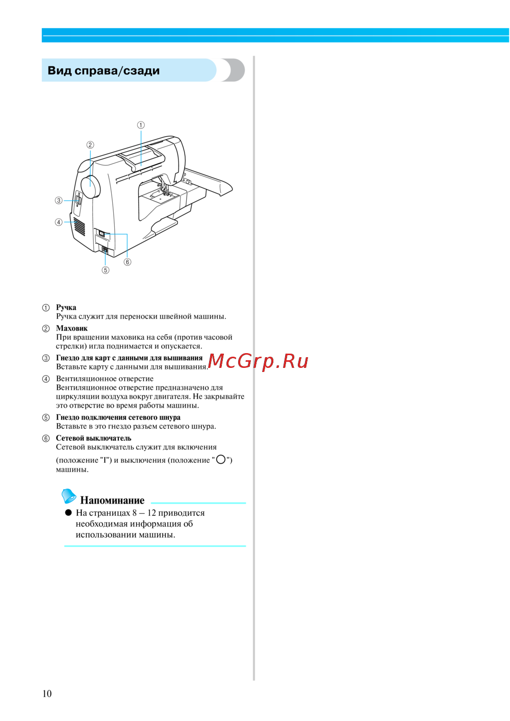 - Ниже приведены наименования различных частей швейной машины и описаны их функции перед началом эксплуатации машины внимательно прочтите эти описания p.10