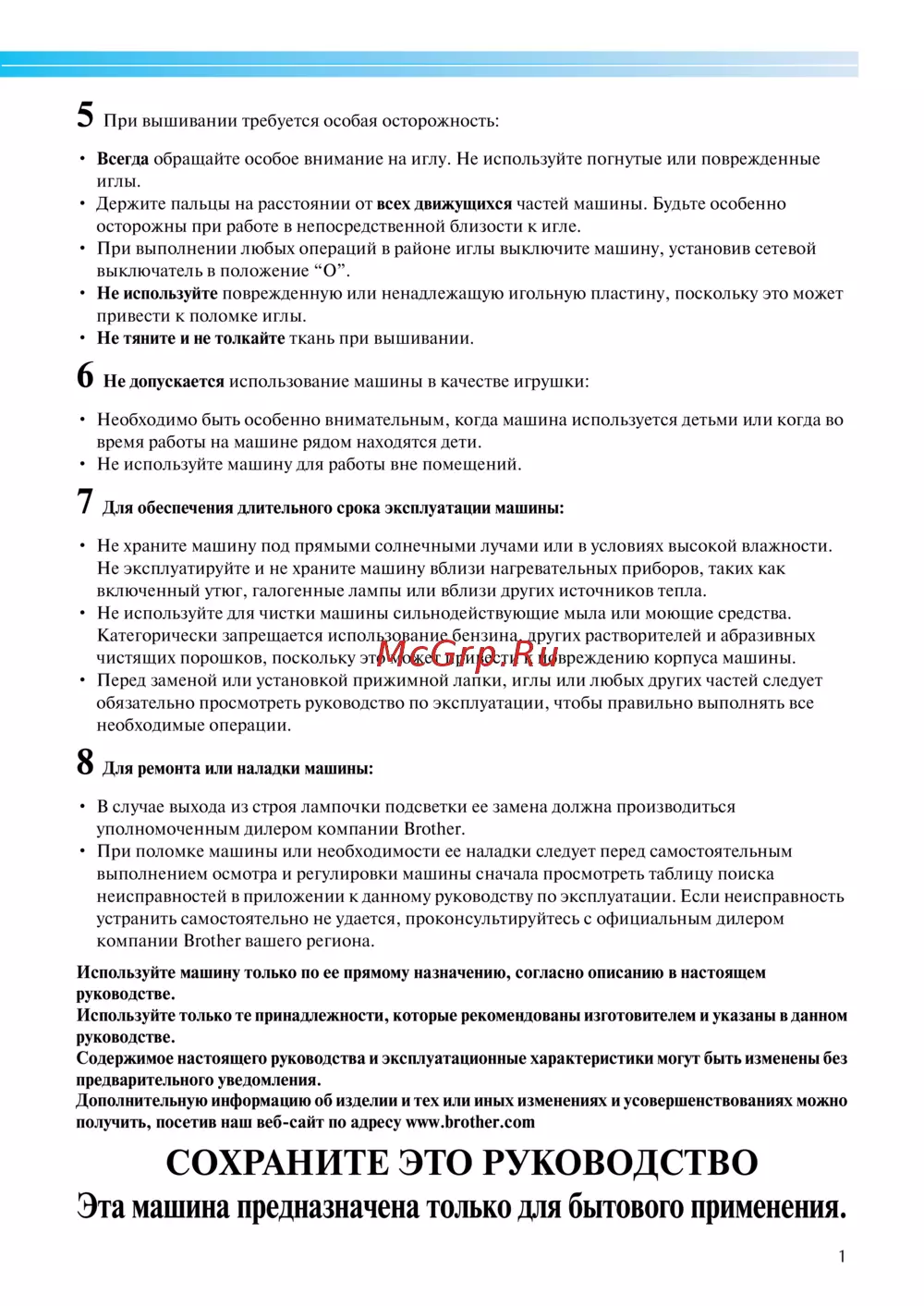 - Благодарим вас за покупку этой швейной машины перед началом эксплуатации машины внимательно прочтите раздел инструкции по технике безопасности а затем изучите настоящее руководство чтобы правильно использовать различные функции машины и выполнять различные операции храните руководство в легкодоступном месте чтобы при необходимости получить всю необходимую информацию p.7