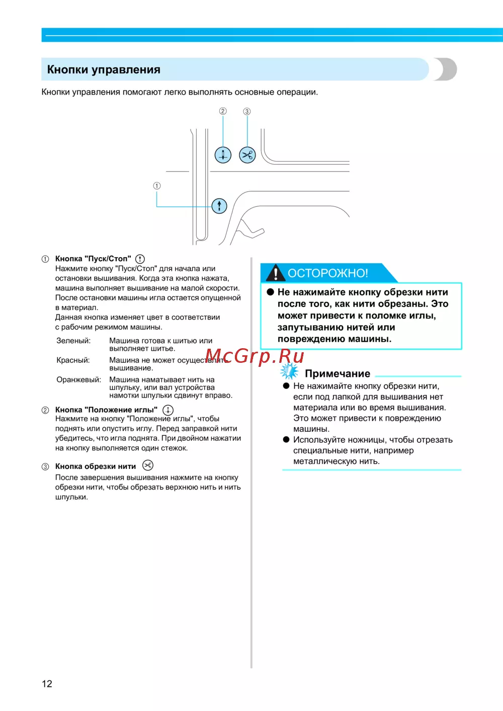 остановки вышивания. Когда эта кнопка нажата,