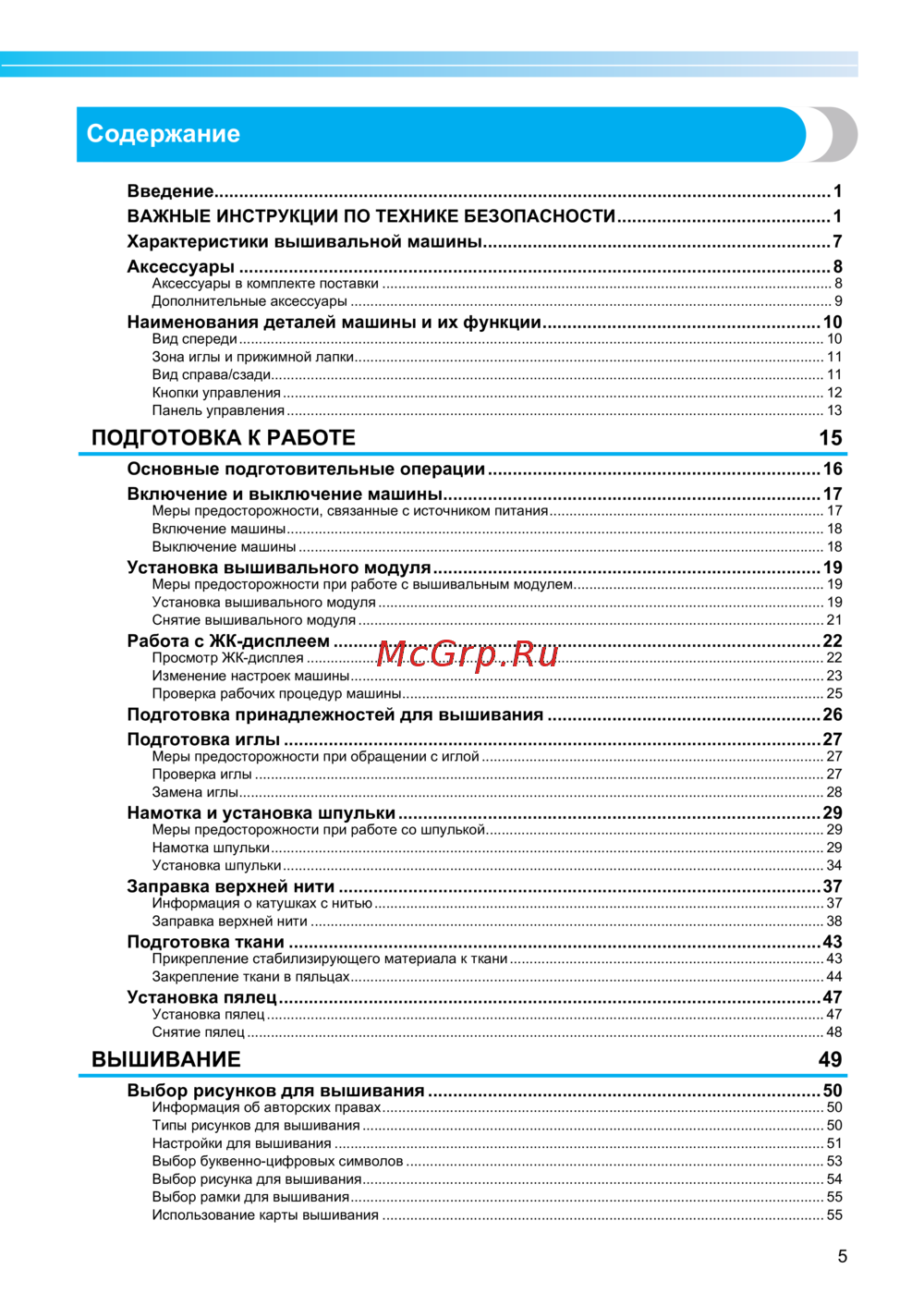 - Введение важные инструкции по технике безопасности характеристики вышивальной машины аксессуары p.7
