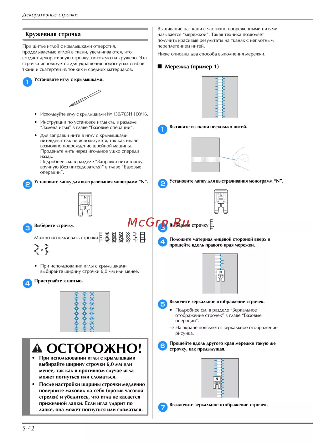 Brother Innov-is F480 [120/208] При использовании иглы с крылышками выбирайте ширину строчки 6 0 мм или менее так как в противном случае игла может погнуться или сломаться после настройки ширины строч...