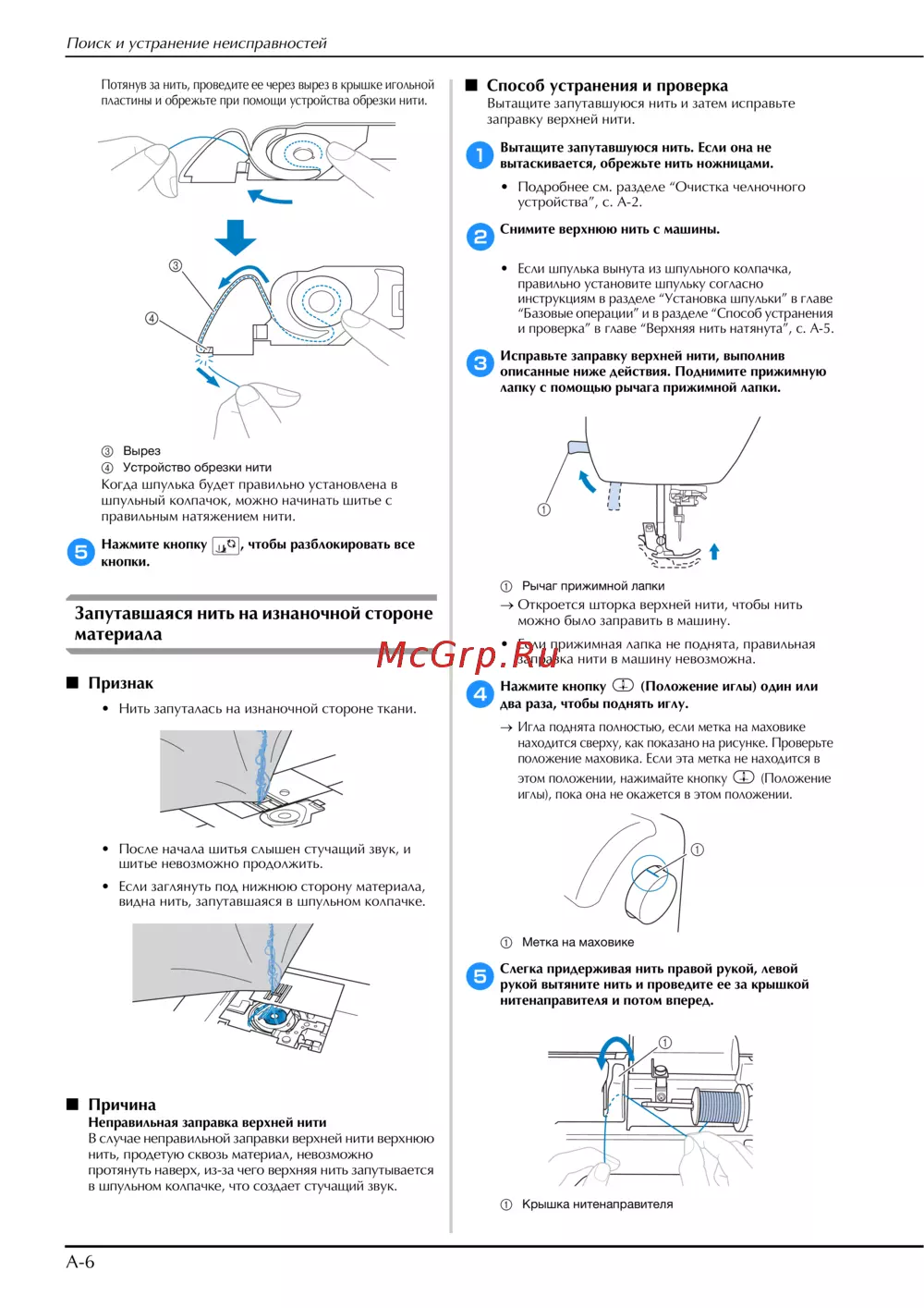 - В случае неправильной заправки верхней нити верхнюю нить продетую сквозь материал невозможно протянуть наверх из за чего верхняя нить запутывается в шпульном колпачке что создает стучащий звук p.188
