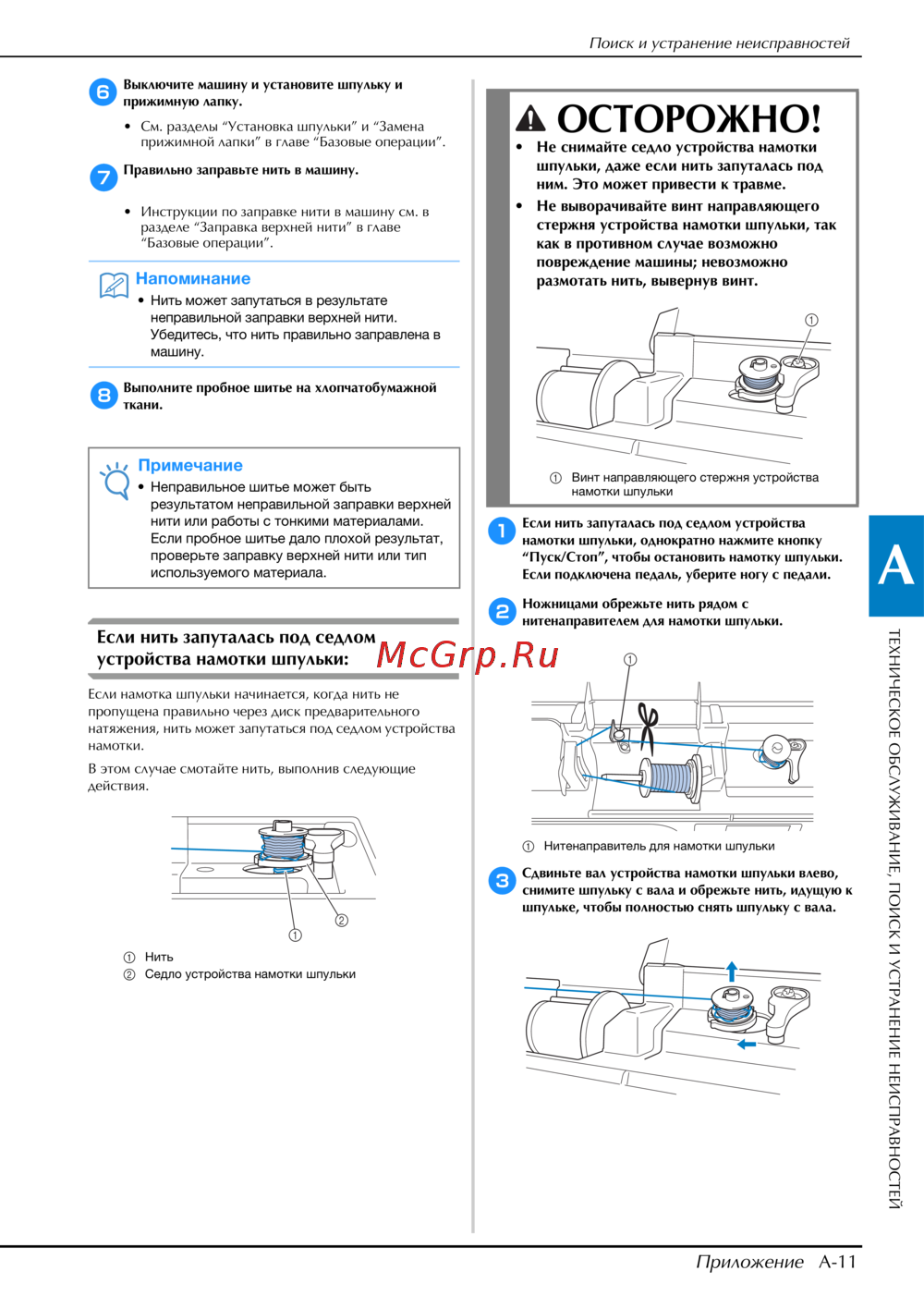 - Если нить запуталась под седлом устройства намотки шпульки p.193